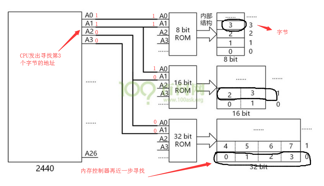 上图连接方式是不同位宽设备与CPU的连接示意图,例如,CPU发出寻找第3字节的地址…0011,8位ROM接收到的是…0011(从内部结构可以看出是第4个字节);16位ROM接收到的是…0001(从内部结构可以看出是第2个字节的部分);32位ROM接收到的是…0000(从内部结构可以看出是第1个字节的部分)。这种连接方式能保证在连接不同位宽的ROM时能够找到对应的位置。16位或更高位ROM字节的具体位置还需要内存控制器近一步寻找。